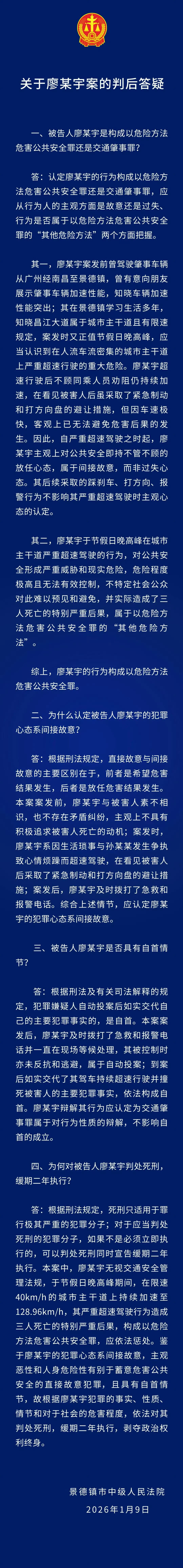 1月9日上午,“一家三口被撞身亡案”在江西景德镇市中级人民法院一审宣判,被告人廖某某以危险方法危害公共安全罪被判处死缓,缓期两年执行,剥夺政治权利终身。宣判后,中国新闻周刊从被害人家属代理律师处获悉,廖某某未当庭表达歉意,双方家属听到判决后都很激动,被害人家属认为判决未达到预期,将申请检察院抗诉。